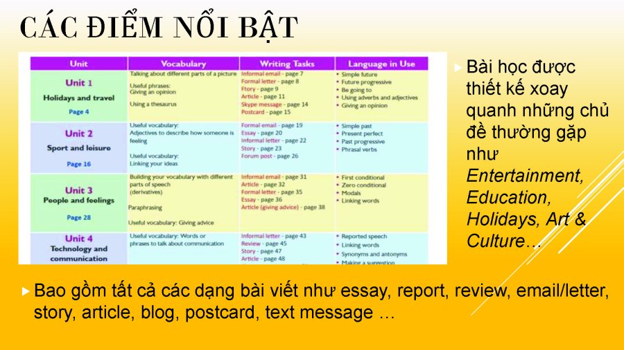 - Cung cấp ý tưởng và bí quyết giúp người học hoàn thành tốt các bài viết trong các kì thi quốc tế như Cambridge b1/B2/C1/C2, LanguageCert